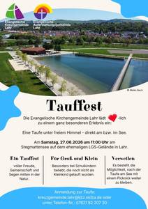 Am Samstag, den 27.06.2026 um 11 Uhr feiert die evangelische Kirchengemeinde Lahr am Stegmattensee auf dem ehemaligen LGS-Gelände ein Tauffest.