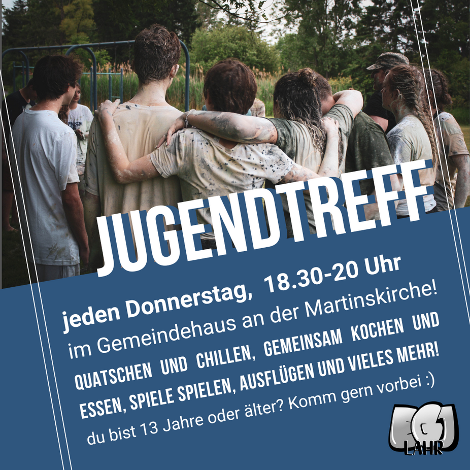 Wir, ungefähr 25-40 Jugendliche (ab 13 Jahre) und junge Erwachsene treffen sich jeden Donnerstag im Jugendtreff von 18.30 Uhr-21.00 Uhr im Gemeindehaus an der Martinskirche, Martin- Luther-Str 4 in Lahr.